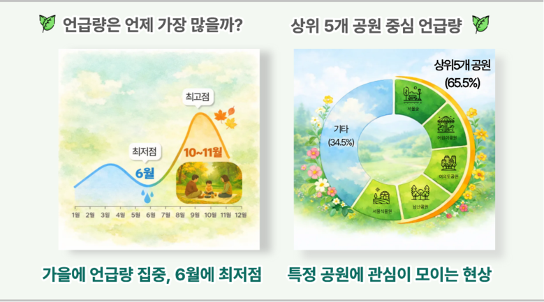재단은 월별 언급량을 통해 공원 이용이 가을(9~10월)에 특히 집중되고 6월에 최저점을 보이는 등 ‘계절에 따른 이용 패턴’을 확인했다.