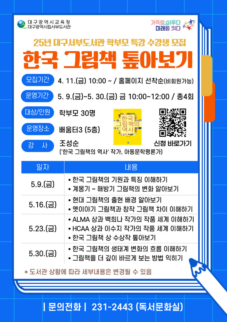 이번 강좌는 그림책을 통한 학부모의 자기 성장과 가족 간 소통을 돕기 위해 마련됐으며, 5월 9일(금)부터 30일(금)까지 도서관 배움터3에서 매주 금요일 오전 10시부터 2시간 동안 4회에 걸쳐 운영된다.