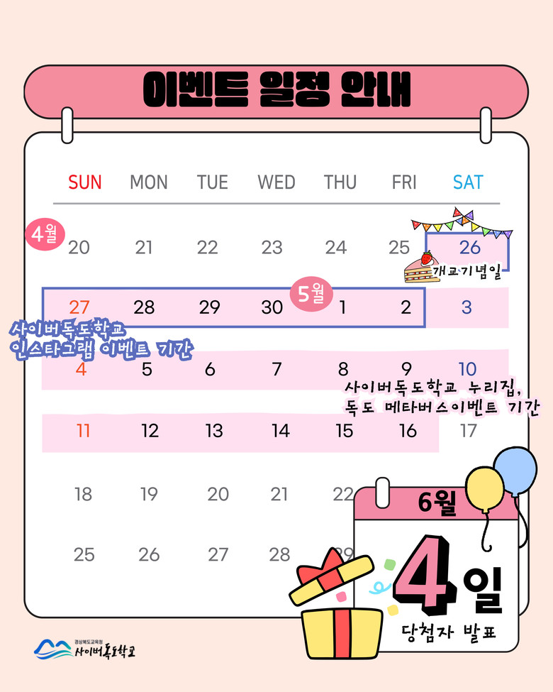 이번 행사에는 사이버독도학교 누리집과 독도 메타버스, 인스타그램에서 총 6개의 다양한 이벤트가 마련된다. 누리집에서는 ‘누리집에 숨은 글자 찾기’, ‘독도교실 수료하기’가 진행되며, 독도 메타버스는 ‘출석체크’와 ‘게임 랭킹 50위’, ‘오류 찾기’ 등을 준비하고 있으며, 인스타그램에서는 ‘개교 4주년 축하 릴레이’가 진행된다.