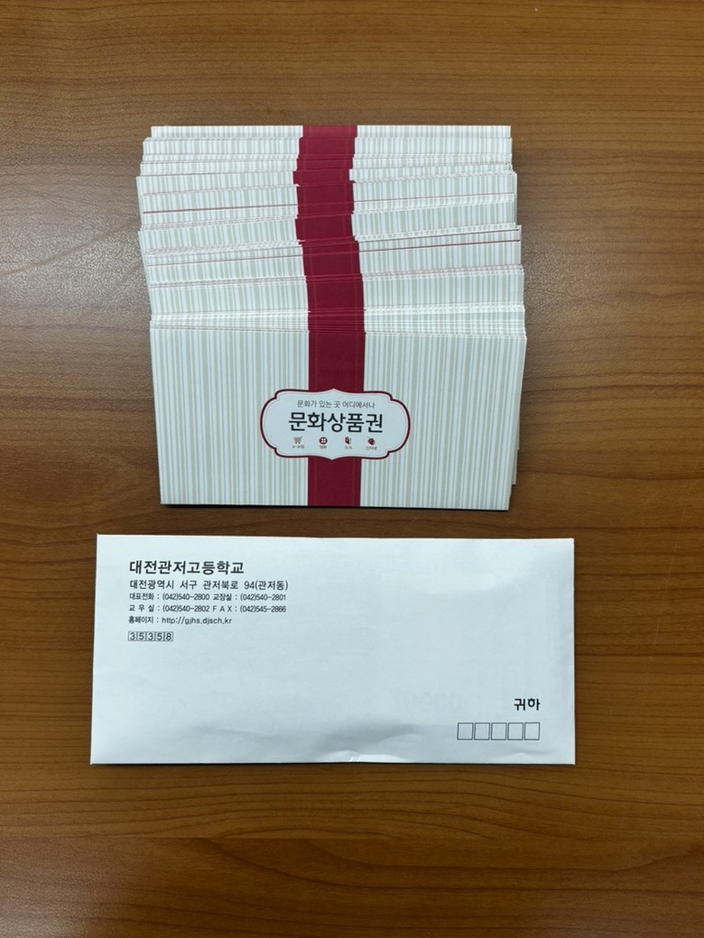 이번 기탁은 관저고등학교 학생들이 동아리 활동의 일환으로 직접 플리마켓을 기획·운영해 모은 수익금 20만 5천 원과 자발적으로 모은 문화상품권 60매(30만 원 상당)로 이뤄졌다.